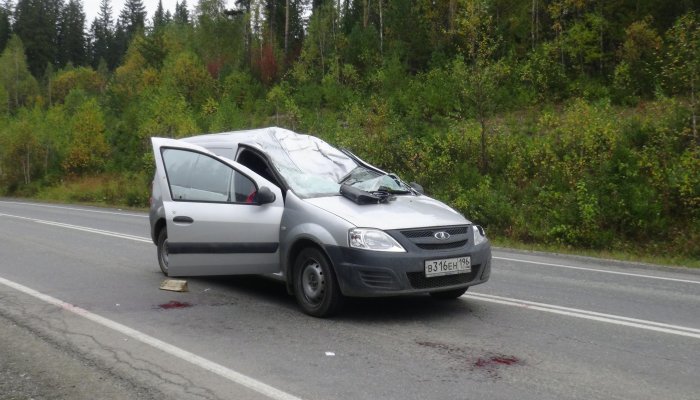 В результате ДТП пассажир а/м Лада-Ларгус - женщина 1954г.р. от полученных травм скончалась на месте ДТП.Водитель с раличными травмами доставлен в ГБ №1 г. Первоуральска. Водитель и пассажир были пристегнуты ремнями безопасности.