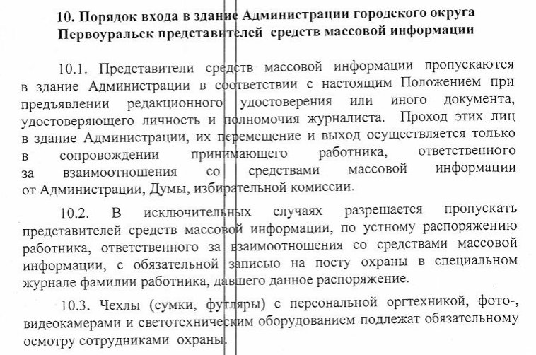 30-ти страничный документ сообщает, что сейчас проход в мэрию по служебному удостоверению возможен, если данного журналиста кто-то пригласил. Причем пригласивший должен постоянно журналиста сопровождать при перемещении по зданию.