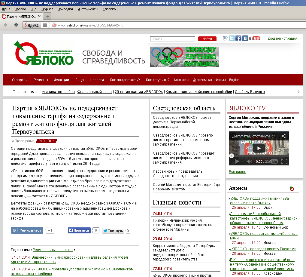 На официальном сайте партии «Яблоко» пришпилина новость дня. В Первоуральске местное отделение партии «Яблоко» совершило геройский поступок!