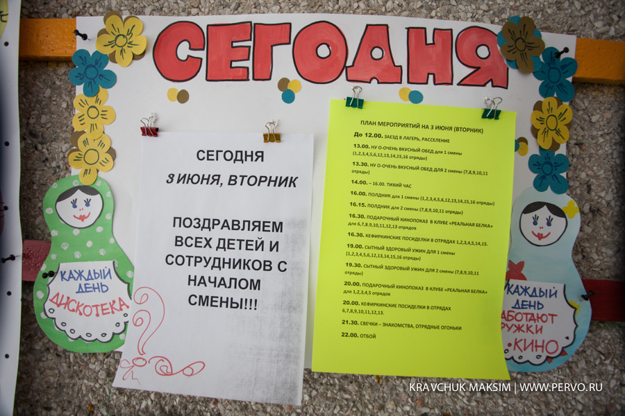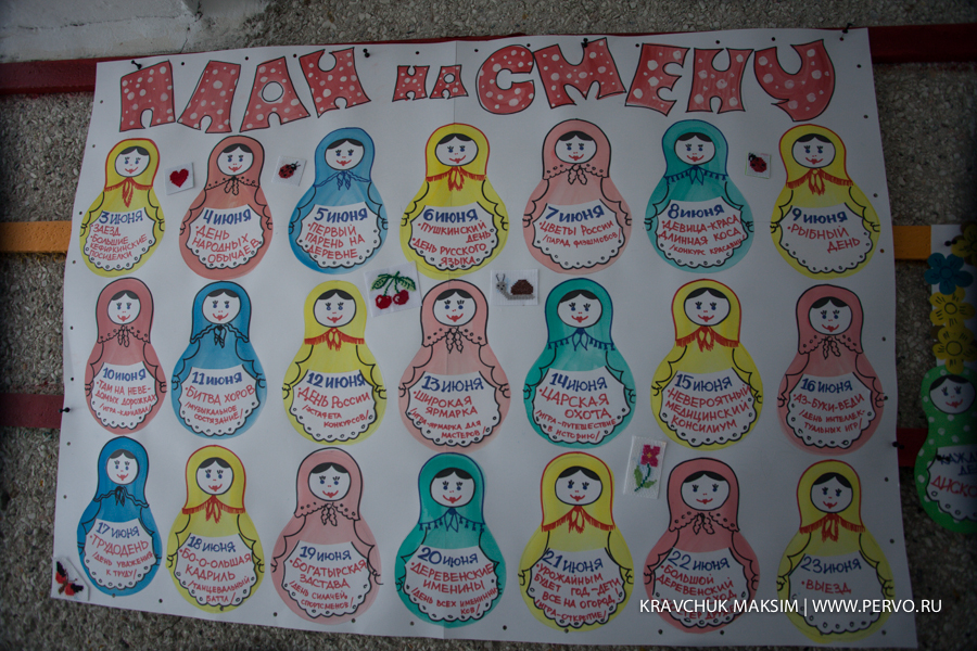 О готовности загородной здравницы к приему детей можно было судить хотя бы по плакатам. Так как главным мотивом предстоящих трех недель станет фольклорный, то и начнется все с больших кефирных посиделок. Запланированы и другие тематические конкурсы, названия которых говорят сами за себя: «Первый парень на деревне», «Широкая ярмарка», «Большая кадриль». «Богатырская застава».
