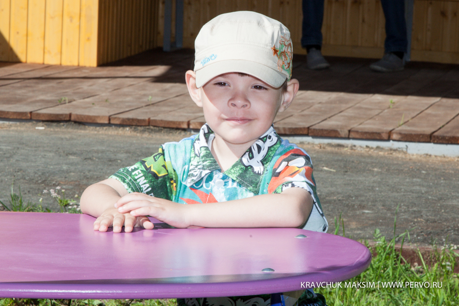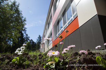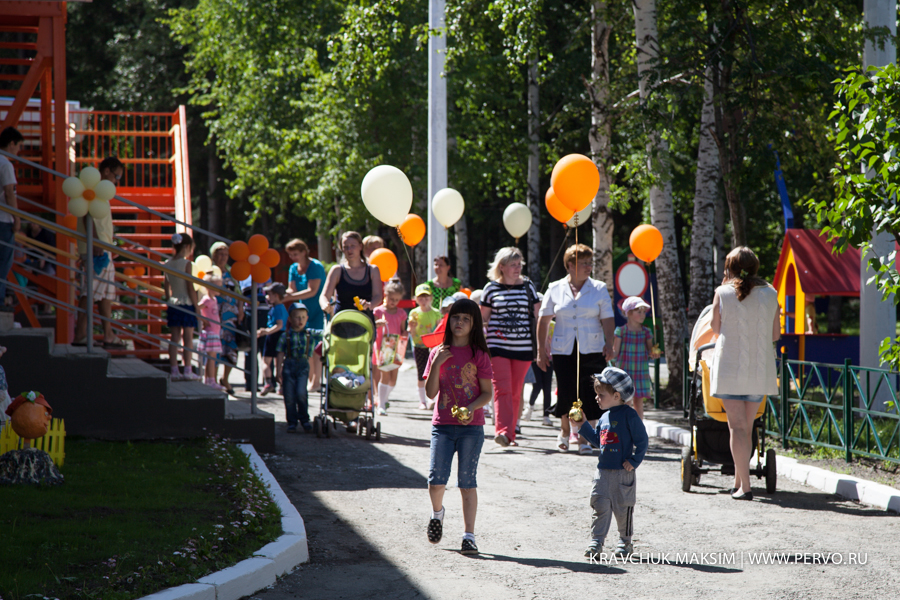 Место в микрорайоне Динас, где сегодня после капитального ремонта открылся новый детский сад, очень праздничное. Яркая зеленая поляна окружена высокими елями. Сквозь елки видны разноцветныепятна – это веранды, кораблики, маленькие спортивные лестницы. Здесь уже с понедельника будут играть воспитанники детского сада.