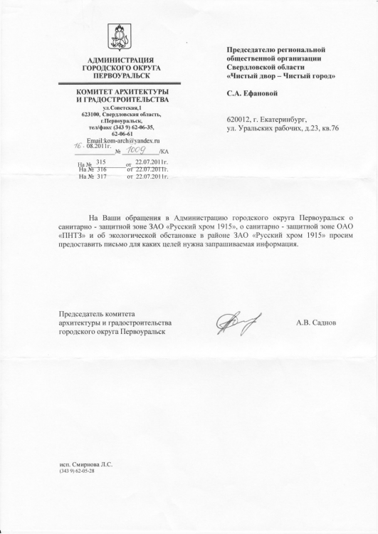 Не менее удивил тот факт, что полученный ответ был от имени председателя комитета архитектуры и градостроительства городского округа Первоуральск А.В. Саднова. Почему запросы, касающиеся экологии, направленные на имя главы города, переадресовали в абсолютно непрофильный комитет, остается непонятным.
