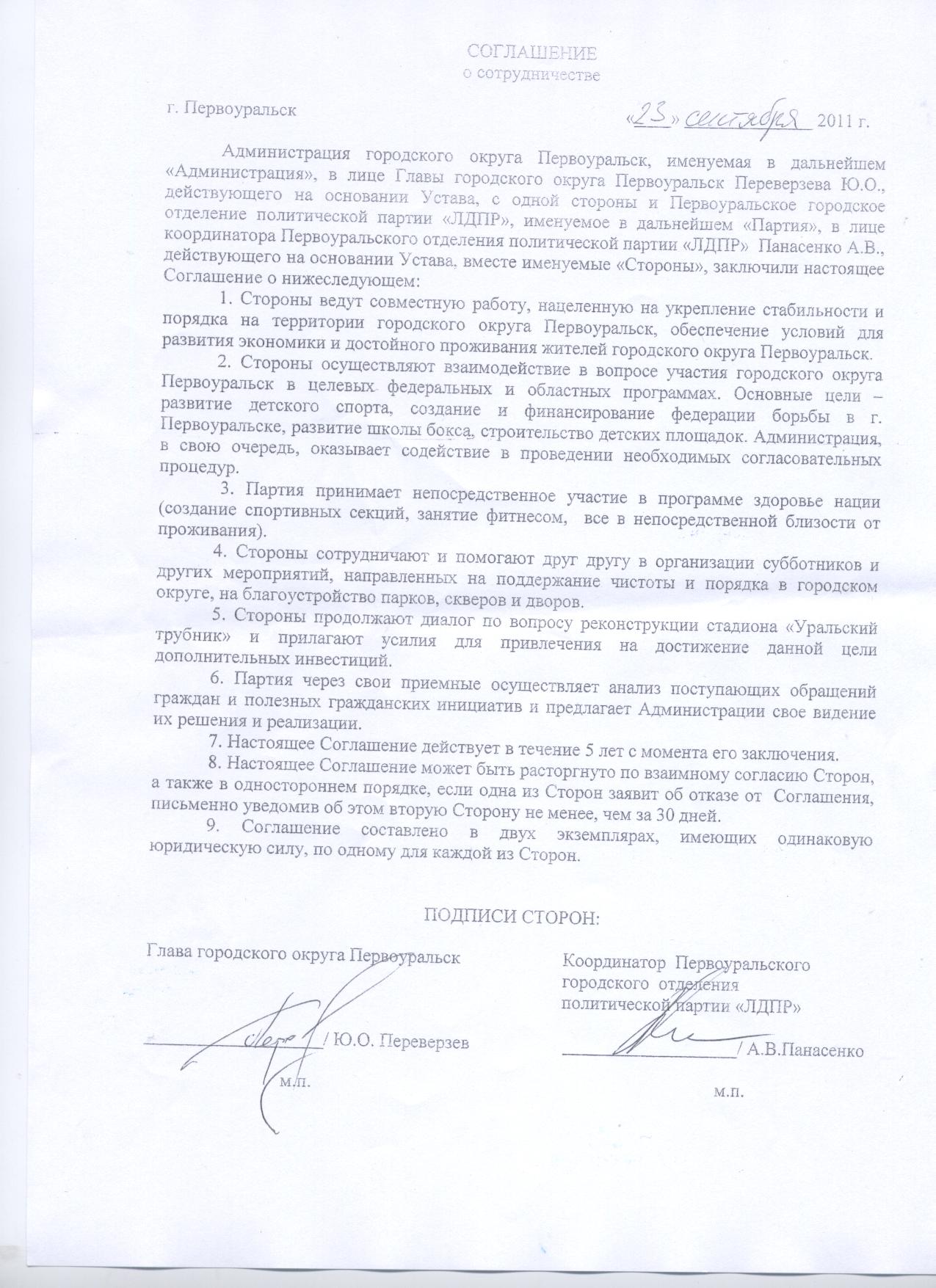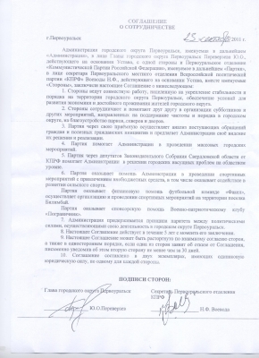 Помимо общих пунктов, где говорится об укреплении стабильности на территории Первоуральска, о продвижении интересов города на областном и федеральном уровнях при помощи депутатов от партий в законодательном собрании и др. в соглашении прослеживается конкретика. Например, КПРФ должна оказывать финансовую помощь футбольной команде «Факел» и военно-патриотическому клубу «Пограничиник». А с отделением ЛДПР продолжается диалог по реконструкции стадиона с целью привлечение дополнительных инвестиций.