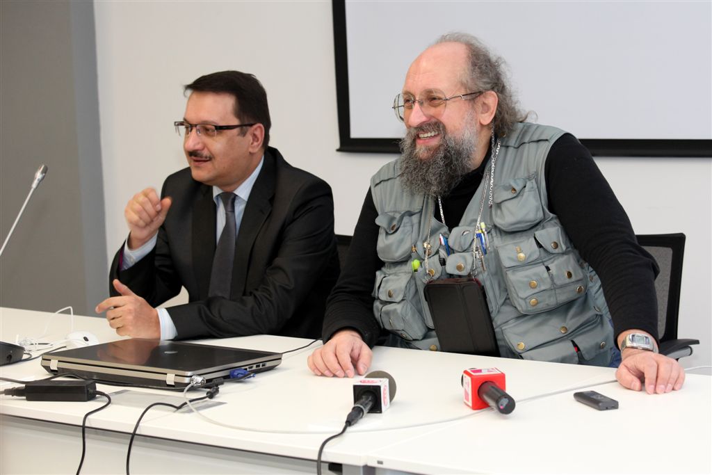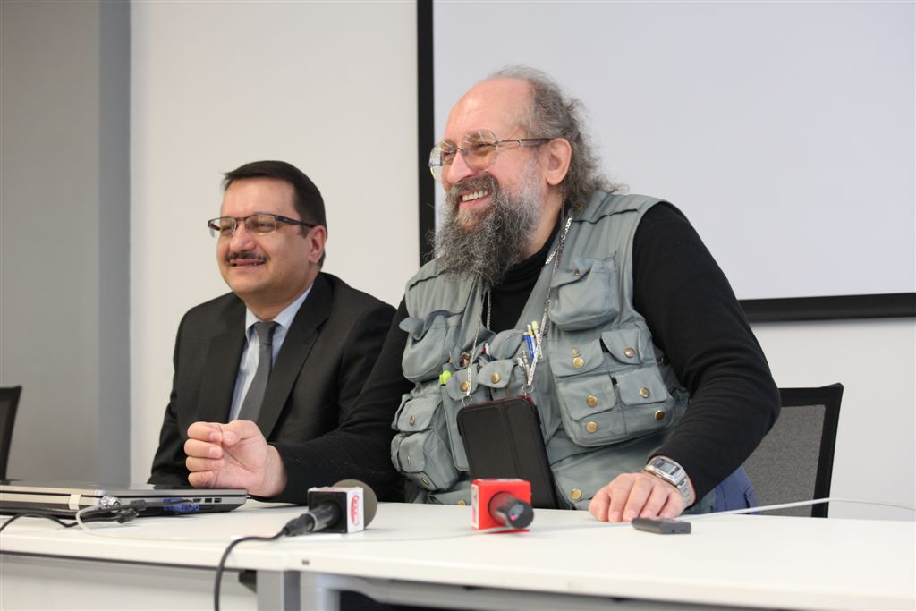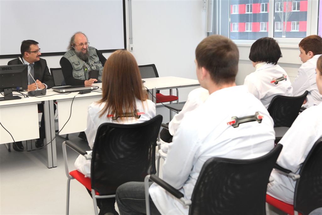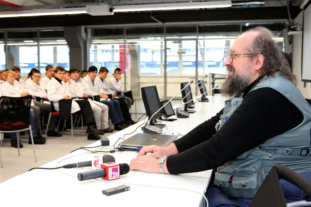 Больше всего времени Анатолий Александрович посвятил общению со студентами учебного центра. В своем знаменитом жилете с многочисленным содержимым весом около 8 кг он рассказал о своем опыте участия в интеллектуальных играх, говорил о пользе чтения и минусах глобальной сети Интернет и давал мудрые советы.
